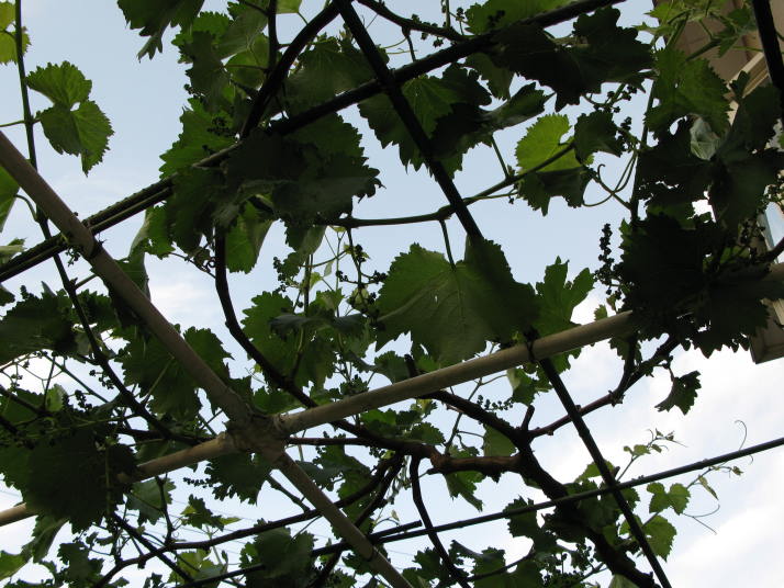 | ・花芽がたくさん出てきて、今年も順調。 木の勢いのよさに楽しみも増す。 ・早くも芯止め。葉っぱの数15〜16枚くらいで??止め、少し葉が少なすぎるとブドウ博士に言われた。 ・花芽を摘み方がわからず適当。 |