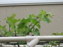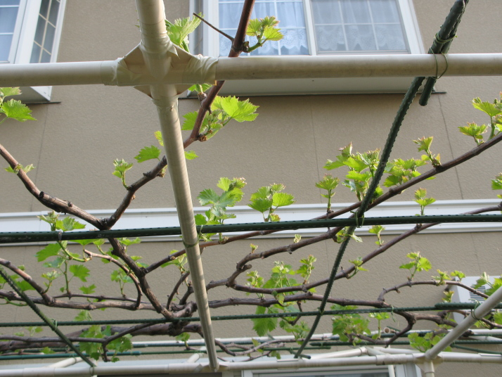 動きなし | ここ2,3日気温が低く、葡萄の枝の成長も 一時止まったみたいになってしまった。 ためしに、お師匠さんちも行ってみたが、 同じような状態。ただし、枝の大きさが見事にそろっている。 我が家の枝は、勢いに強弱があって、枝の葉の枚数にも ばらつき。(結果母枝の先のほうが勢いがいい) |