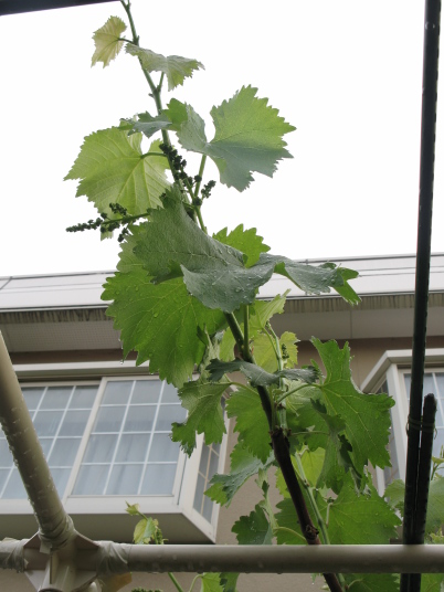 jジベレリン処理 | まだ、花房の1/4くらいしか咲いていないのに、待っていられずジベレリン処理をした。25PPM(1gを2Lに薄める)液(食紅をくわえたでも、漬けてもわからなかった)に、2.3秒、花房を全部浸す。デラウェアでは花の咲く2週間前に・・ということなので、今でもいいかなと・・1度目のジベレリンは種なしにするため。これで効果が出るかどうか見てみたい。 花の房は上部4枝くらいカットしてもまだ8〜10センチくらいある、今日は底の部分1センチくらいをほとんどカットした。脇芽つるもカット。 |
