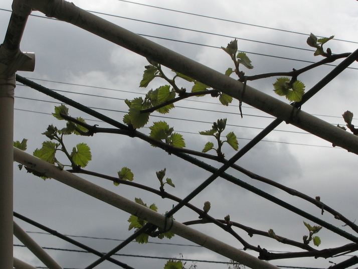 | 5/18 | 3.4日雨だったり、強い風がふいたり、寒かったりと天候が悪い。 巨峰の育ちもいったん休止のような・・ 風が強いと折れる枝があったり、葉が傷むのでハラハラする。 房作りで、昨年はほんの上部をカットして、あと、下部を1cmほどカットしたが、 今年は上部をもっと多くカットして、下部は全部残して使うようにしよう。その方が、形のいい 間延びのしない房になる気がする。 2,3日うちに1度予備の消毒をしたい。ジベレリンはまだ1週間後位になりそう。 |