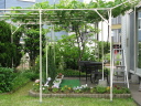 | 5/5 | 風にふかれ、テラスのベンチに座ってコーヒー片手にぼーっとブドウを眺めていると 至福のひと時。 結婚式に来た美鈴や和子さんたちにとてもうらやましがられた。 今年は枝の太い部分から枝分かれしている部分に葉がなくぽっかり穴があく。 本に先ばかり勢いのいいのはよくないとあり、先端の勢いがいい新枝を3か所剪定した。 根元の葉に元気をつけるため。 次の日樹液がぽたぽた落ちていた。まずい!! 蔓を曲げて広い場所へ誘引をはじめた。 |