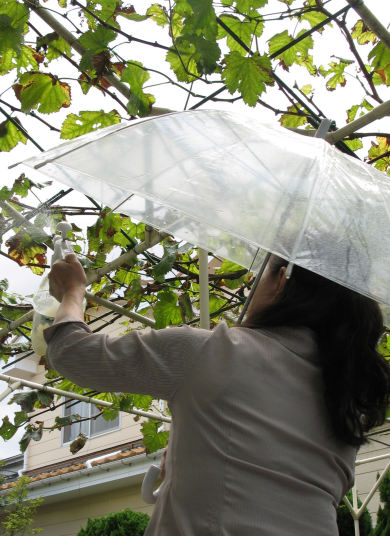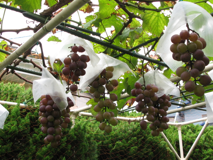 消毒 | 16日の最後の収穫に記念撮影。来年の反省として、粒をつけすぎないことは第一だが、 あまり収穫を急がない方がいいかもしれない。 少し腐敗するものが出ても、時間をかければ甘くなる率は高い気がする。 9/20にスミチオンで消毒。ブドウスカシバには効果がないかも。 透明のビニール傘をさして、下からたっぷり吹き付ける。 10/10の葉の様子と10/30日の葉っぱ。 もうほとんど落ちてしまった。 冬の剪定と雪に備えて、棚の細かい枠を取り除く作業を11月中にする。 |